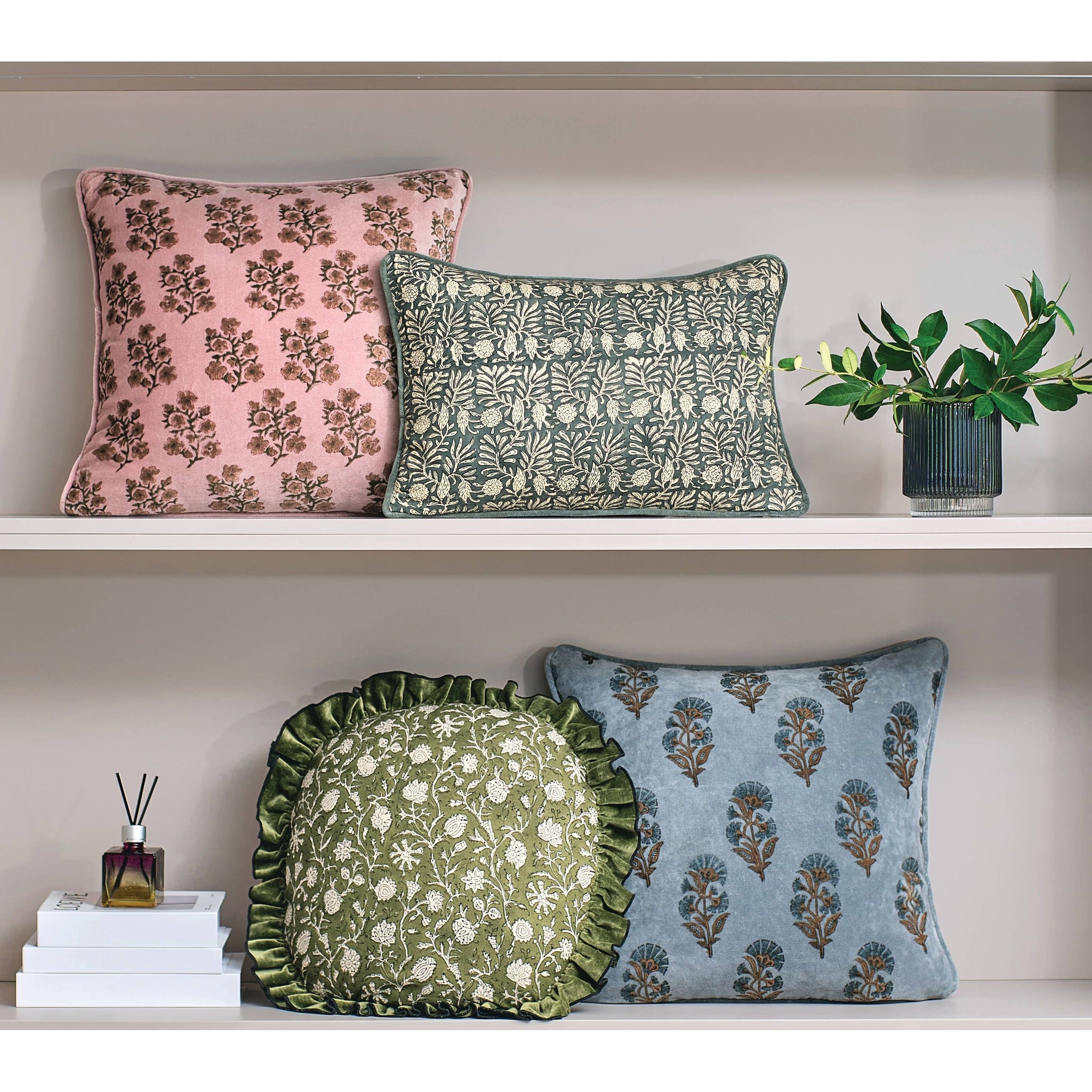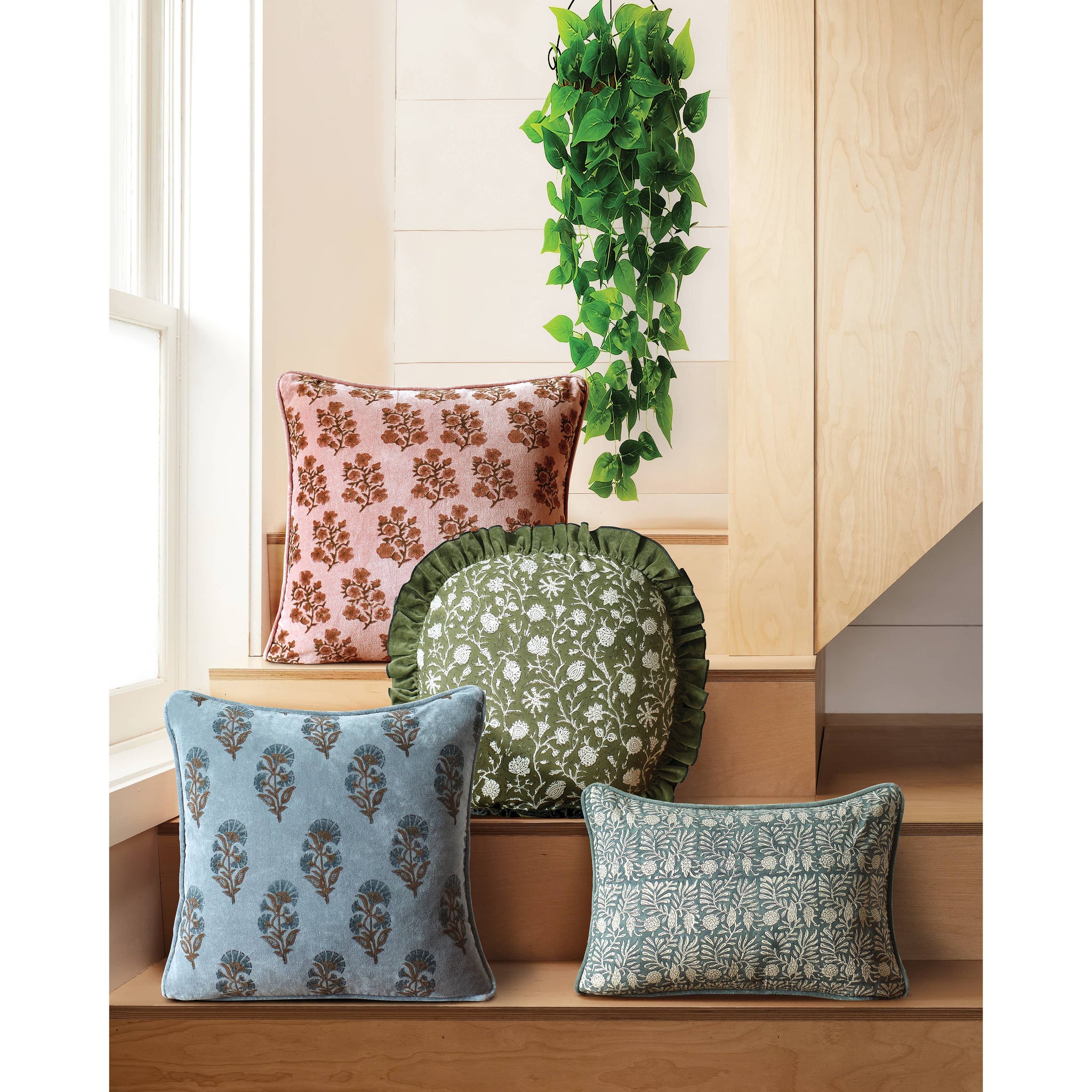 ★100% cotton decorative square pillow ★100% cotton velvet backing ★Block Printed Pillow ★Includes polyester insert, zipper closure ★20X20" throw pillow