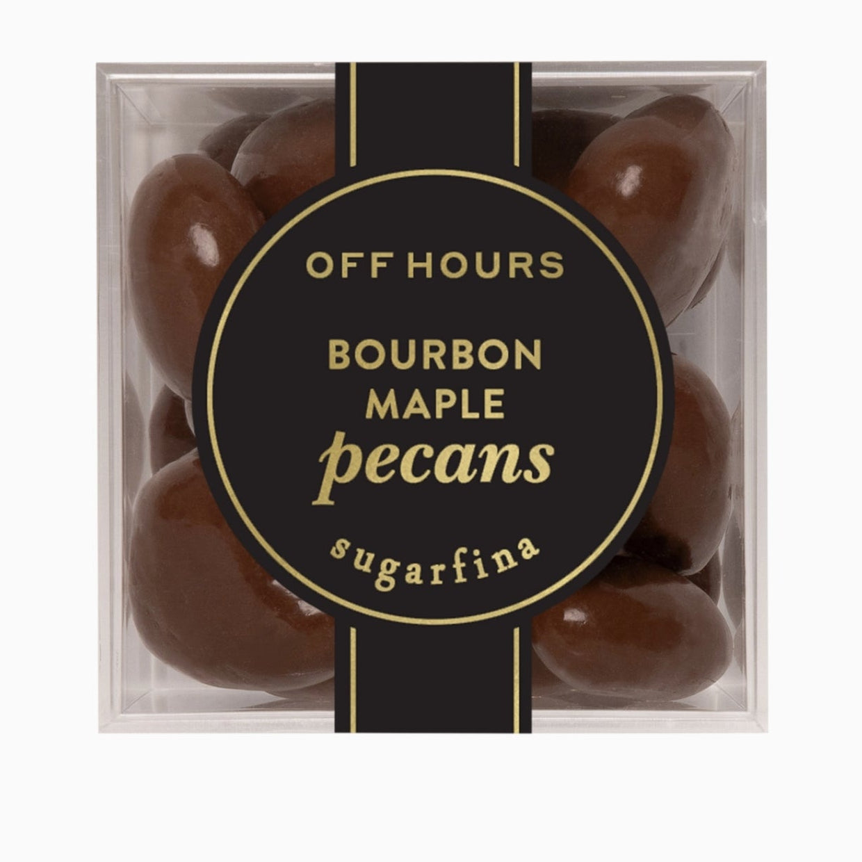 Bold and smooth! These glazed pecans are coated in the flavor of sweet maple and dipped in bourbon-flavored dark chocolate.