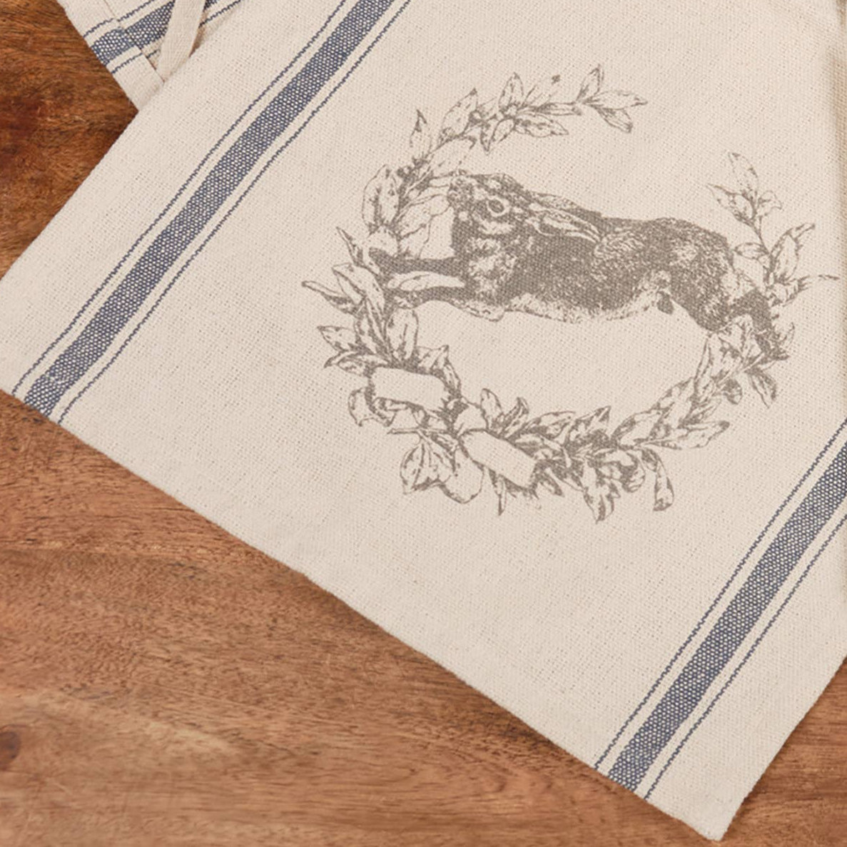 A cotton kitchen towel from our Easter & Spring Collection displaying vintage style design of a jumping rabbit and floral crest with blue stripes woven along each side. Towel includes cotton tape loop in corner for hanging. Our Jumping Rabbit kitchen towel is machine-washable for convenient cleaning.