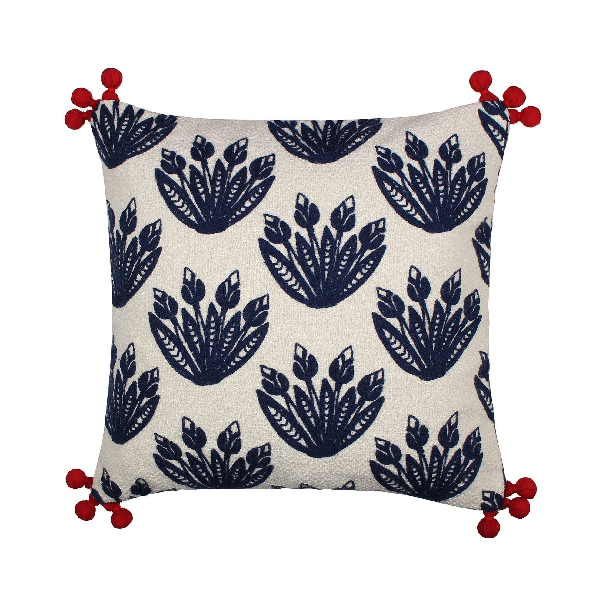 The Floral Medallion decorative pillow matches perfectly with the Levtex Home Nanette bedding collection. This pillow is sized at 18 x 18 in. and features an interesting repeating floral motif repeated in navy crewel stitch on a textured cream ground and finished with red pom poms in each corner. The color palette makes this a versatile accessory for your bed, couch or favorite chair. The pillows comes pre-filled with a soft luxurious feather inner.