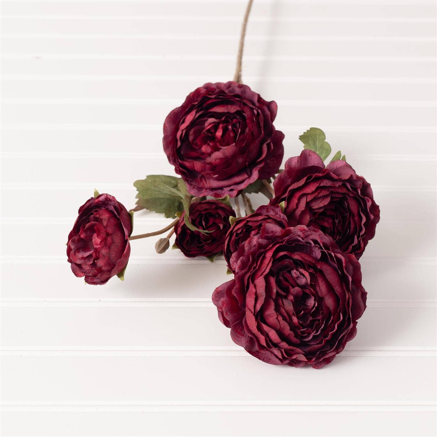 Introducing the Burgundy Ranunculus Pick, a product of Audrey's Home & Gift. This artificial floral pick is meticulously designed with polyester and wire, stretching to a length of 31.5".