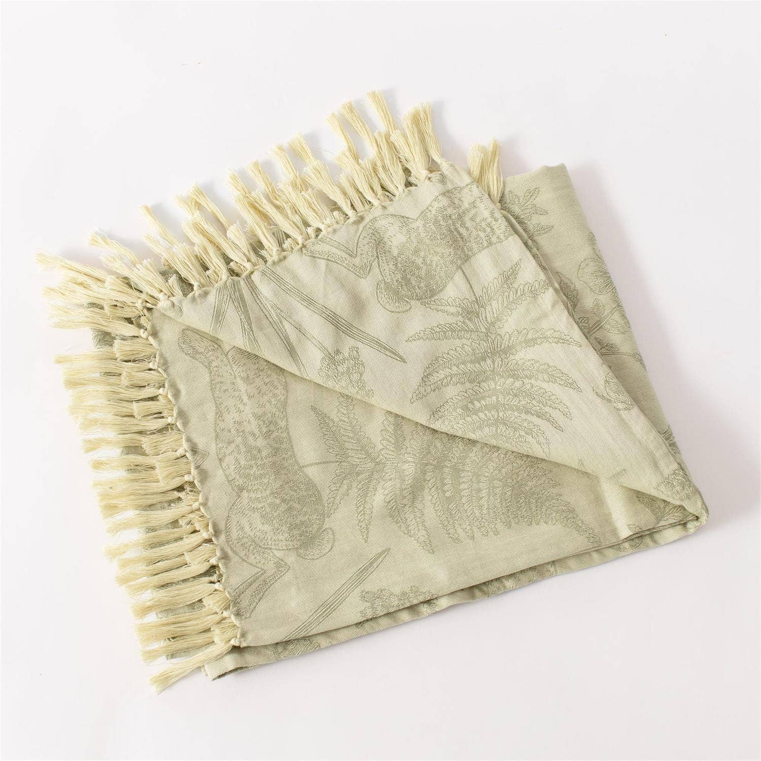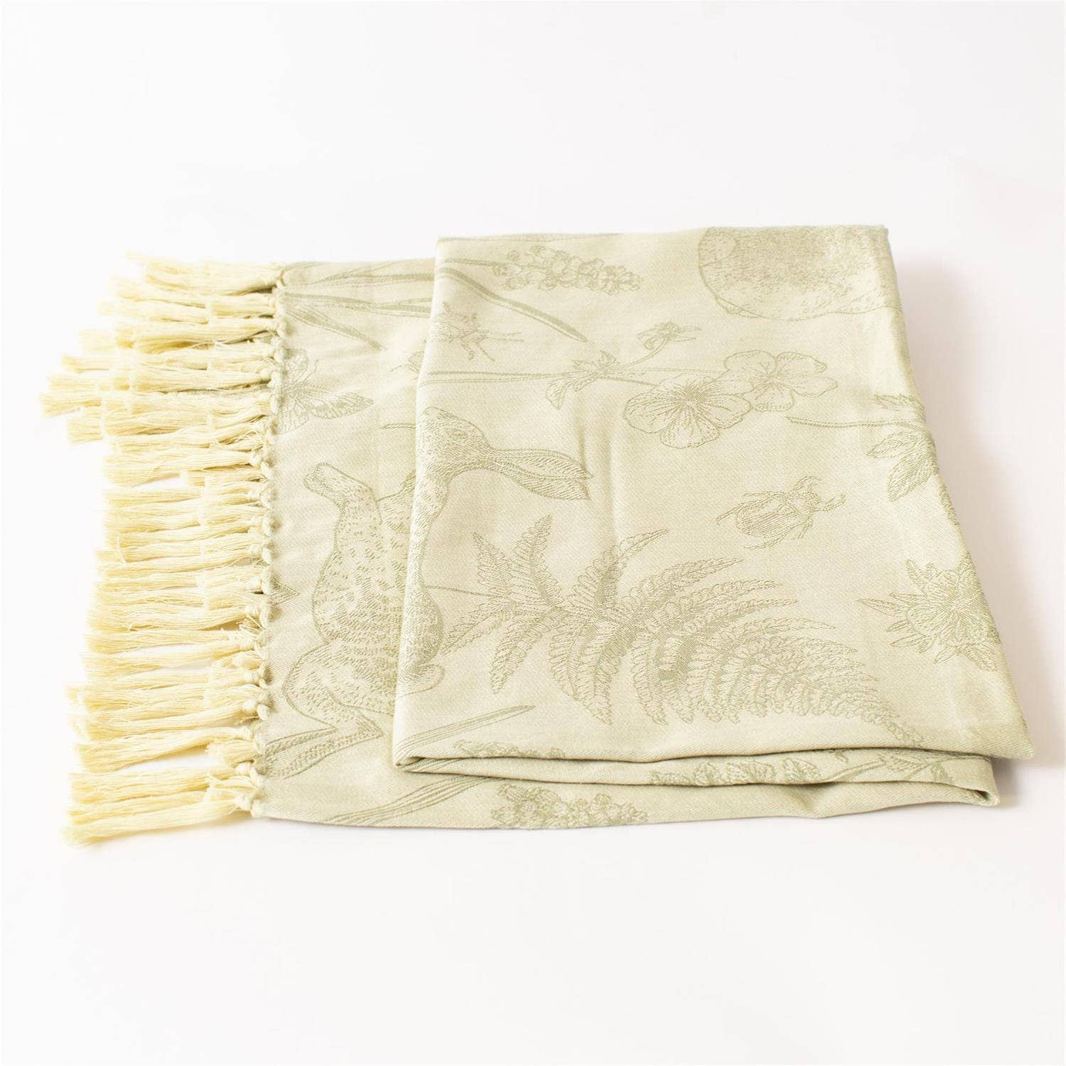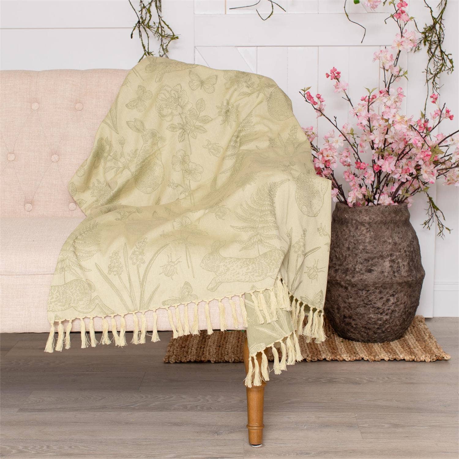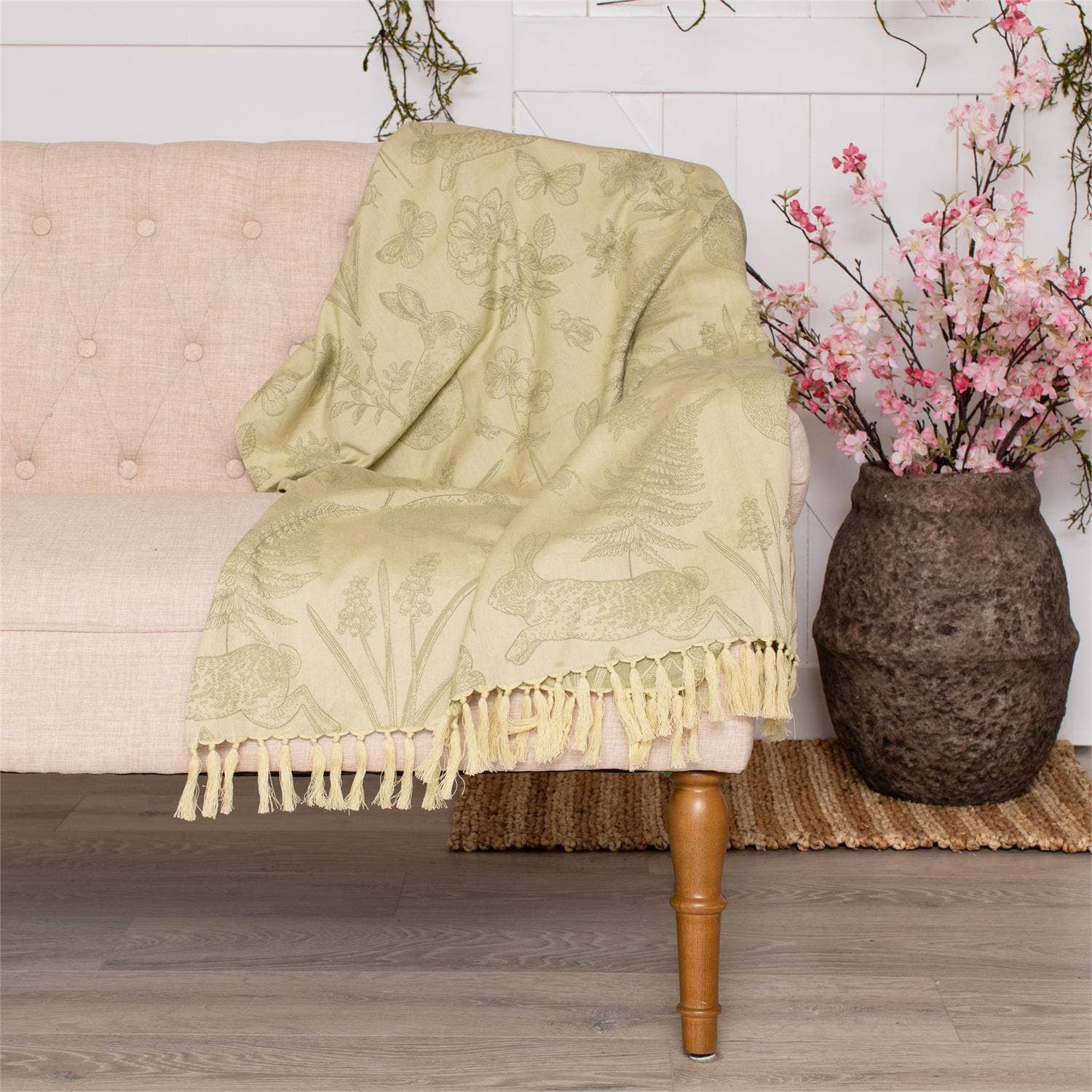 Bring the peaceful charm of woodland life into your home with this Rabbit and Fern Jacquard Throw. Featuring intricately woven imagery of bunny rabbits, ferns, butterflies, and wildflowers, this soft cotton throw makes a cozy and elegant accent for sofas, chairs, or beds. The natural spring tones and tasseled edge add a rustic, heirloom appeal. Cotton 50" W x 60" L.
