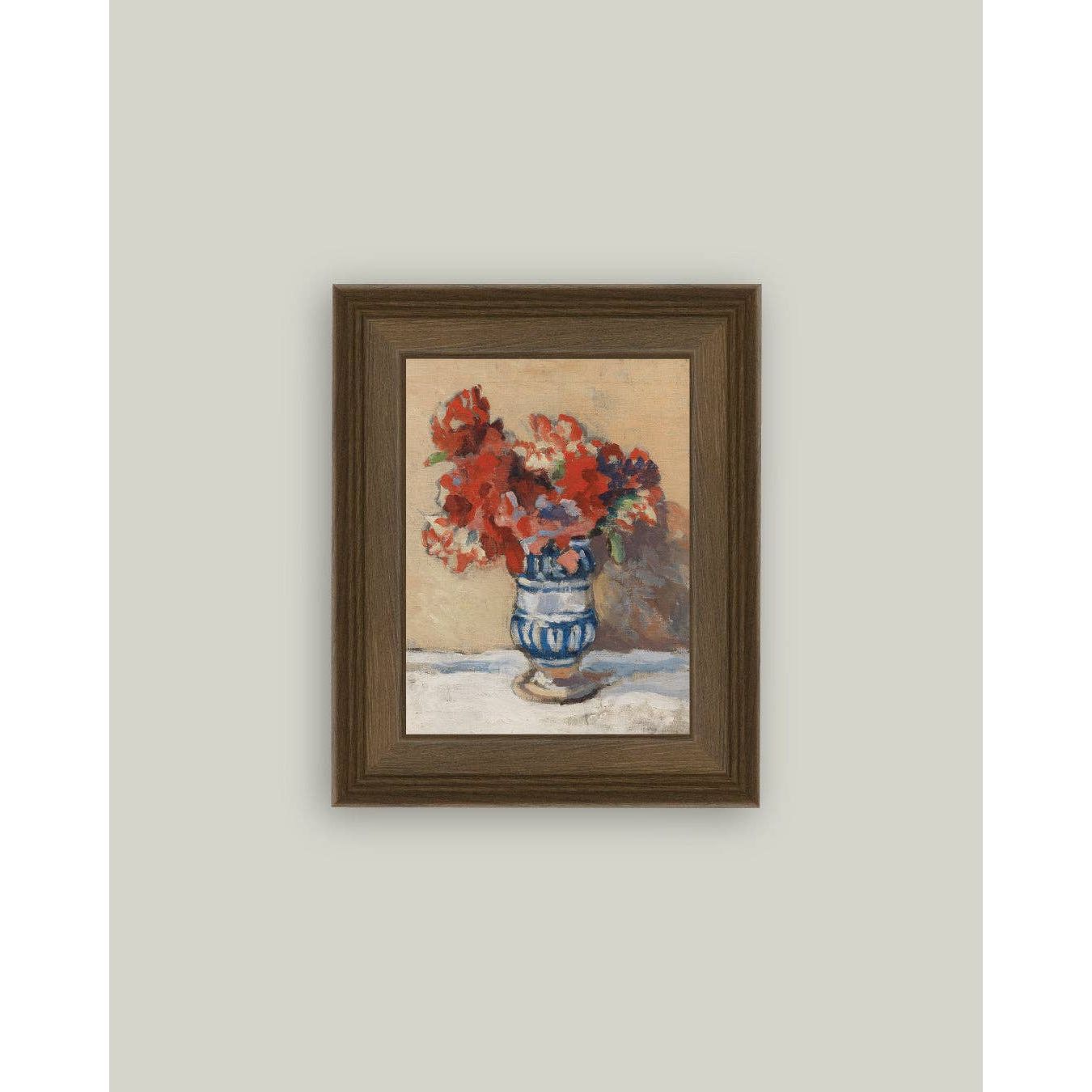 Red Flowers in Blue Vase Framed Antique Art: 12x16