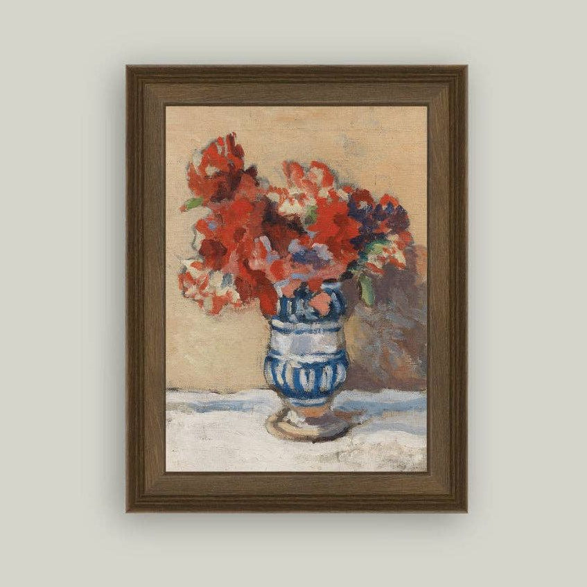 Red Flowers in Blue Vase By Christopher Wood, 1900s Features: Artwork Material: Printed on premium canvas fabric for a lasting, textured finish. Measurement reflects the outside dimensions of the frame. Frame Details: Handcrafted ornate frame adds classic charm. Hardware Included: Comes with a paper backing and hanging hardware for easy installation. Glass-Free Design: Keeps the artwork lightweight and true to its original texture.